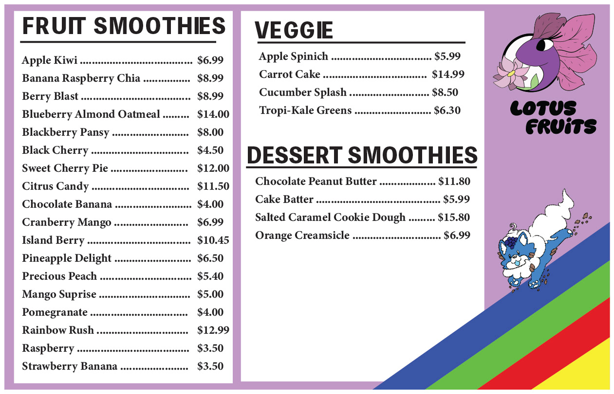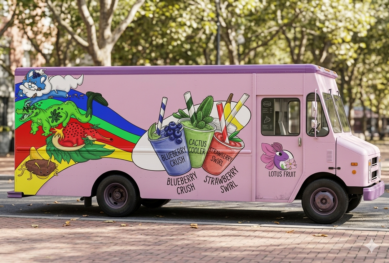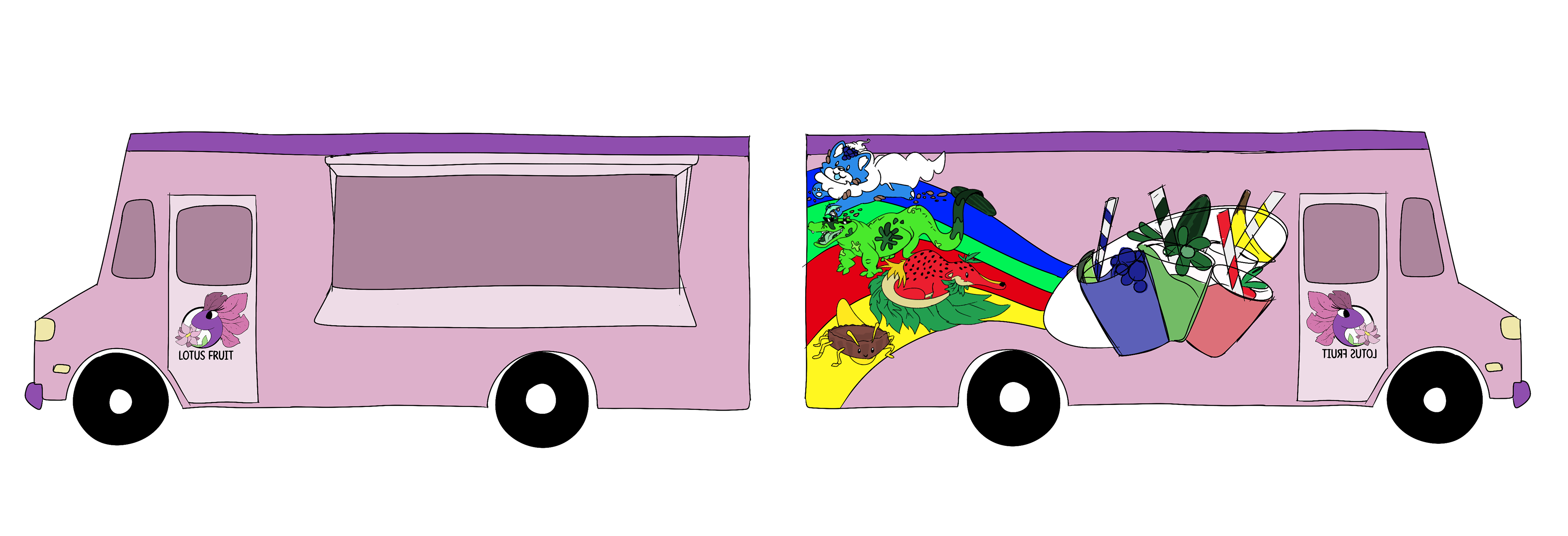 My design features a creature I personally created for the food trucks official branding and logo. For this, I created a menu, food truck design, smoothie options, and tons of creatively designed original characters.