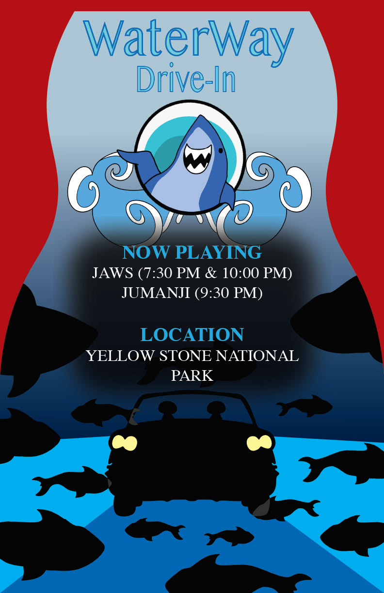 The Water-Way Drive-In Theatre is a premier family destination designed to transport guests into a vibrant, underwater world from the comfort of their cars. Centered around the friendly, waving shark mascot from the logo, the theatre’s identity is built on a “Deep Sea Movie showing” theme that emphasizes high-energy fun and maritime wonder.